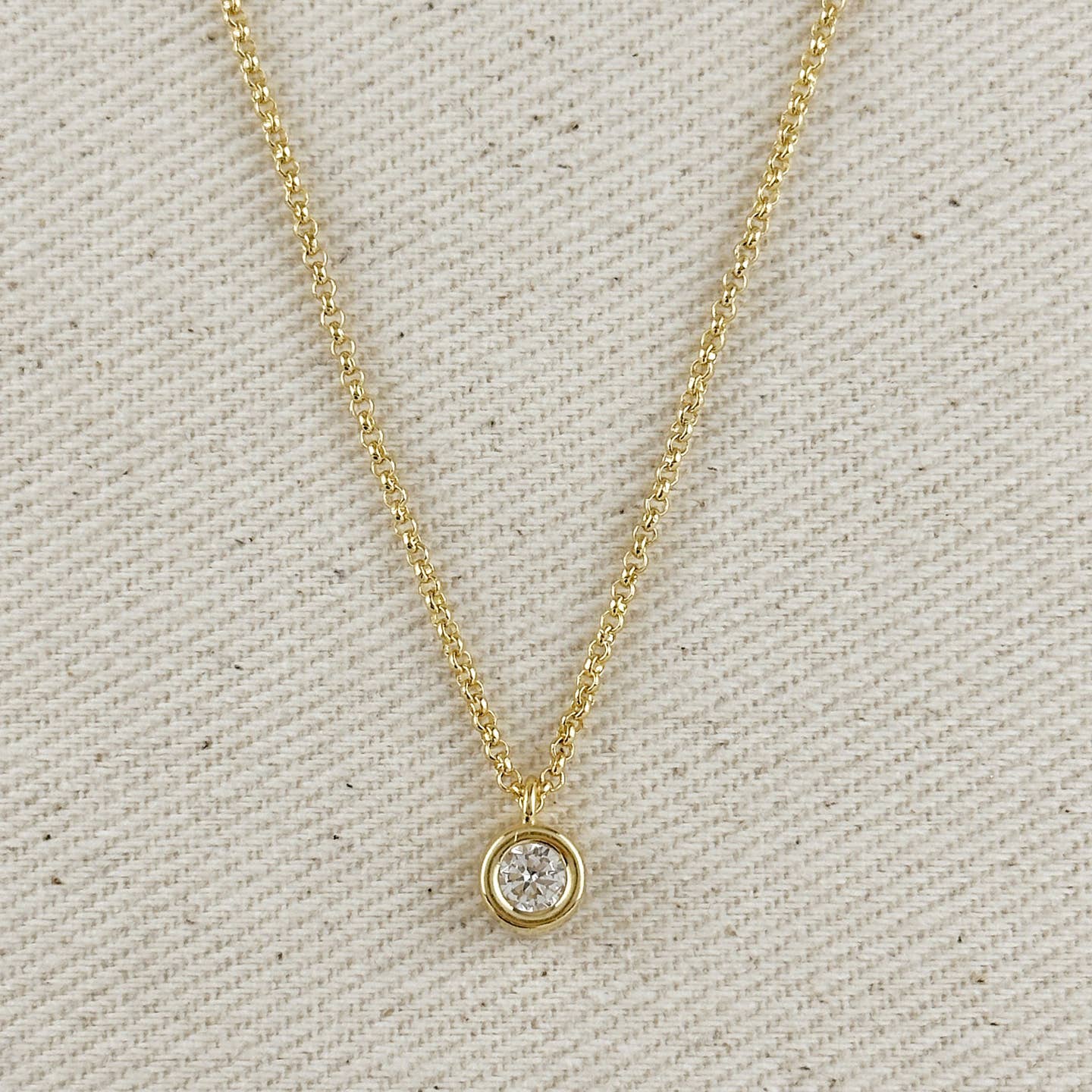 Elevate your jewelry collection with this expertly crafted 18k gold filled solitaire necklace. Featuring a brilliant 6mm AAAAA cubic zirconia stone, it captures and reflects light with exceptional clarity. The delicate 15.5" chain includes a 2" extender adorned with a teardrop charm, allowing versatile styling and a perfect fit. Hypoallergenic and water-resistant, this handcrafted piece offers lasting quality and sophistication, ideal for layering or wearing solo. A refined choice for yourself or a thoughtful gift.