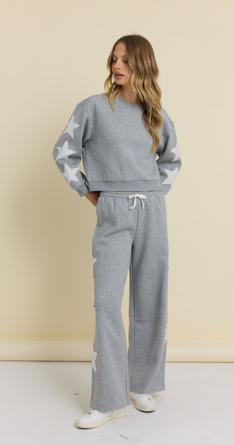 Wrap yourself in cozy comfort with this moon grey crewneck hoodie featuring plush reverse terry fabric that feels as soft as a cloud. The playful star appliqué adds a touch of whimsy to your everyday look, making it perfect for lounging, running errands, or stargazing adventures. Whether you're layering up for chilly days or going solo on milder evenings, this versatile piece brings effortless style and snuggly warmth to your wardrobe.