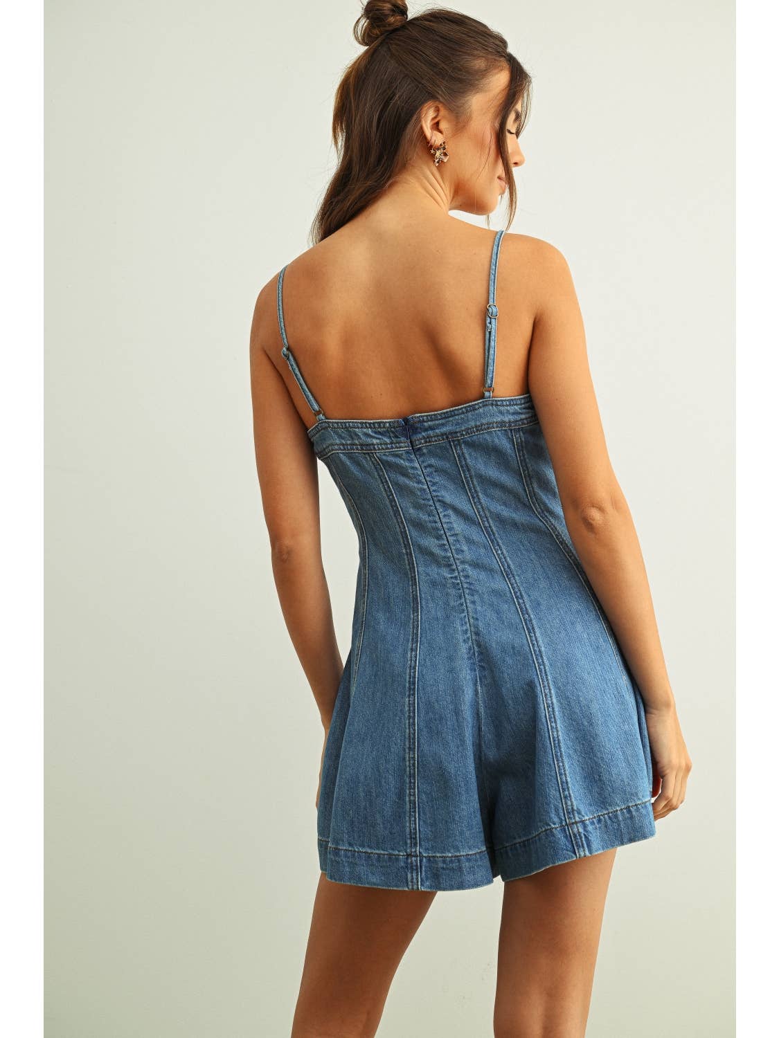 Effortlessly chic and oh-so-comfortable, this paneled washed denim romper is your new go-to for casual adventures. The soft, vintage-inspired denim pairs perfectly with its flattering paneled design, creating a silhouette that's both fun and figure-friendly. Throw it on with sneakers for a laid-back vibe or dress it up with sandals and accessories for weekend outings. One-piece styling means less time deciding what to wear and more time enjoying life. A playful wardrobe essential that proves denim never goes out of style.