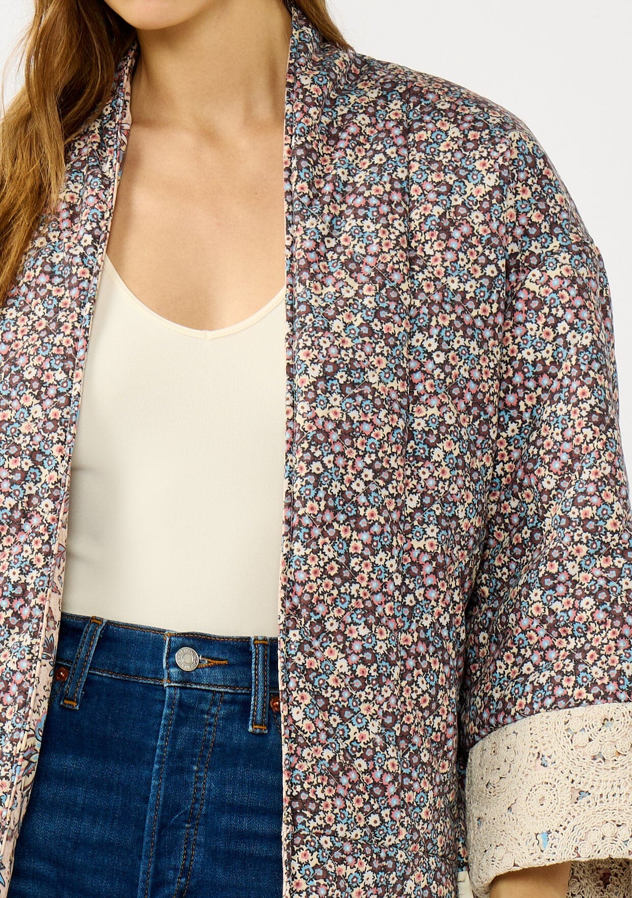 Introducing the Fiona Floral Reversible Jacket—your new favorite layer for effortless style! This quilted beauty features charming floral patterns that bring a pop of personality to any outfit. Practical side pockets keep your essentials close, while delicate crochet lace trims add a touch of whimsy and texture. Perfect for layering over your favorite tees or dresses, this jacket transitions seamlessly from casual coffee runs to weekend adventures. Cozy, cute, and ready to become your go-to piece.